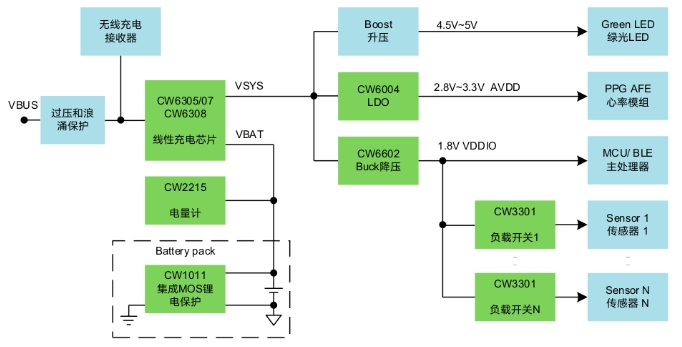 隨著技術(shù)的飛速發(fā)展,智能指環(huán)作為新興智能可穿戴設(shè)備越來越被品牌廠商所關(guān)注。中國(guó)穿戴廠商華米在CES 2024期間發(fā)布了名為Helio Ring的智能指環(huán)新品;韓國(guó)三星電子于2024年7月正式發(fā)售指環(huán)產(chǎn)品Galaxy Ring,市場(chǎng)反響熱烈。智能指環(huán)既有裝飾潮品的時(shí)尚屬性,又是智能手機(jī)的輔助智能感知配件,用于人體健康數(shù)據(jù)的監(jiān)測(cè)。相比手表和手環(huán),指環(huán)更貼合皮膚,因此在收集人體基礎(chǔ)生物信息,如脈搏、心率、血氧、心電圖,以及監(jiān)測(cè)體溫等方面更有精準(zhǔn)度優(yōu)勢(shì)。指環(huán)相比智能手表,還有無感佩戴的特點(diǎn),更能滿足用戶的差異化需求。智能指環(huán)受限于空間尺寸,配備的鋰電池容量通常在15~23mAh,而續(xù)航時(shí)間則需要達(dá)到5天或更久。因此,超低功耗且超小尺寸的芯片必為產(chǎn)品開發(fā)者所青睞。賽微微電(CellWise)已經(jīng)量產(chǎn)多款超低功耗的小尺寸電源芯片,如Figure1所示,都非常適用于智能指環(huán)應(yīng)用。Figure 1.智能指環(huán)電源方案線性充電器-CW6308、CW6305/6307CW6308是一款支持I2C接口和電源路徑管理的線性充電芯片,尺寸為業(yè)內(nèi)最小,充電電流最大支持320mA。在僅有電池供電并開啟Watchdog功能后,芯片工作電流仍低至5μA。CW6308還支持500nA超低功耗模式和300nA船運(yùn)模式,封裝為WLCSP-9,尺寸為1.24mm*1.24mm。CW6305/6307功能與CW6308一致,區(qū)別是可支持最大470mA充電電流,芯片封裝尺寸為WLCSP-9,1.55mm*1.55mm。電量計(jì)-CW2215單節(jié)鋰電池電量計(jì)CW2215的工作電流僅為5μA,是業(yè)內(nèi)最低,內(nèi)置高精度ADC,支持電壓、電流和溫度監(jiān)測(cè)。芯片內(nèi)置“FastCali”算法,結(jié)合對(duì)客戶電池樣品建模測(cè)試提取的電池特征參數(shù),可完成對(duì)電池剩余電量(SOC)、循環(huán)數(shù)(Cycle)和電池健康(SOH)的精確計(jì)算,并可配置對(duì)低電量、高溫或低溫的情況進(jìn)行中斷上報(bào)。CW2215為WLCSP-9封裝,尺寸為1.58mm*1.53mm。LDO低壓差穩(wěn)壓器-CW6004CW6004是一款超低功耗LDO,靜態(tài)工作電流低至300nA。其輸入電壓1.6V~5.5V,輸出電壓有1.1V, 1.2V, 1.5V, 1.8V, 2.5V, 2.8V, 3.0V和3.3V可選,輸出電流為200mA。CW6004具有快速的動(dòng)態(tài)響應(yīng)特性,當(dāng)設(shè)備從Standby輕載快速切換到Active重載的工作場(chǎng)景下,VOUT輸出電壓也能保持穩(wěn)定。該芯片為DFN-4封裝,尺寸為1.0mm*1.0mm。Figure 2.  CW6004靜態(tài)電流vs輸入電壓Figure 3.  CW6004 Ground電流vs 輸出電流Buck降壓轉(zhuǎn)換器-CW6602、CW6603CW6602是一款超低功耗Buck降壓轉(zhuǎn)換器,輸入電壓為2.15V~5.5V,輸出電壓為1.2V~3.3V共8檔可選。其靜態(tài)工作電流低至330nA,負(fù)載電流能力為0.6A/峰值電流1.0A。在1.8V輸出電壓時(shí),芯片的重載效率達(dá)90%以上,100uA輕載的效率也可達(dá)85%。該芯片具有快速的負(fù)載動(dòng)態(tài)響應(yīng)能力,封裝為WLCSP-8,尺寸為1.575mm*0.825mm。CW6603的功能和尺寸與CW6602一致,區(qū)別是輸出電壓范圍為0.6V~1.2V。Figure 4.CW6602 Vout=1.8V的轉(zhuǎn)換效率負(fù)載開關(guān)-CW3301CW3301是一款超低MOS導(dǎo)通電阻的負(fù)載開關(guān),輸入電壓為1.1V~5.5V,最大通流能力2.0A。芯片的輸出電壓擺率(slew-rate)受控,有效保護(hù)后級(jí)芯片;CW3301具有業(yè)內(nèi)領(lǐng)先的5nA On-State靜態(tài)工作電流和12nA Off-state漏電流,并支持輸出快速放電可選;其封裝為WLCSP-4,尺寸為0.76mm*0.76mm。鋰電保護(hù)-CW1011CW1011為單節(jié)鋰電池保護(hù)芯片,支持高精度過壓、欠壓、充電過流、放電過流和短路保護(hù)。芯片內(nèi)部集成了54mΩ導(dǎo)通電阻的Dual MOSFETs;其靜態(tài)工作電流為2.5μA,并支持休眠模式,功耗低至20nA。CW1011的封裝為DFN-6,尺寸為2.0mm*1.5mm。賽微微電(CellWise)深耕超低功耗電源技術(shù)多年,在智能手表、TWS耳機(jī)、主動(dòng)手寫筆、無線藍(lán)牙鍵鼠等可穿戴設(shè)備和數(shù)碼配件上擁有眾多design wins。今天介紹的這些電源芯片,一定也可以助力各品牌廠商和方案開發(fā)者,實(shí)現(xiàn)智能指環(huán)的更小空間堆疊、更長(zhǎng)電池續(xù)航和更優(yōu)用戶體驗(yàn)。感謝大家對(duì)賽微微電公司和產(chǎn)品的持續(xù)關(guān)注。